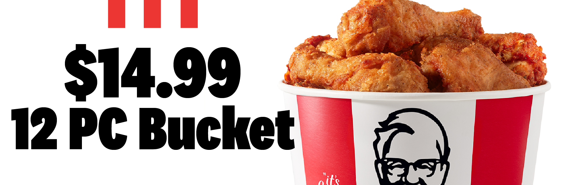 $14.99 12-Piece Chicken Bucket Offer Valid In-Store Only. See Details Below: Get your hands on 12 pieces of our delicious world famous chicken! Choose between our Mixed Bucket (3 drums, 3 thighs, 3 breasts and 3 wings) or our all-dark meat Drum & Thigh Bucket (6 drums and 6 thighs) for just $14.99.